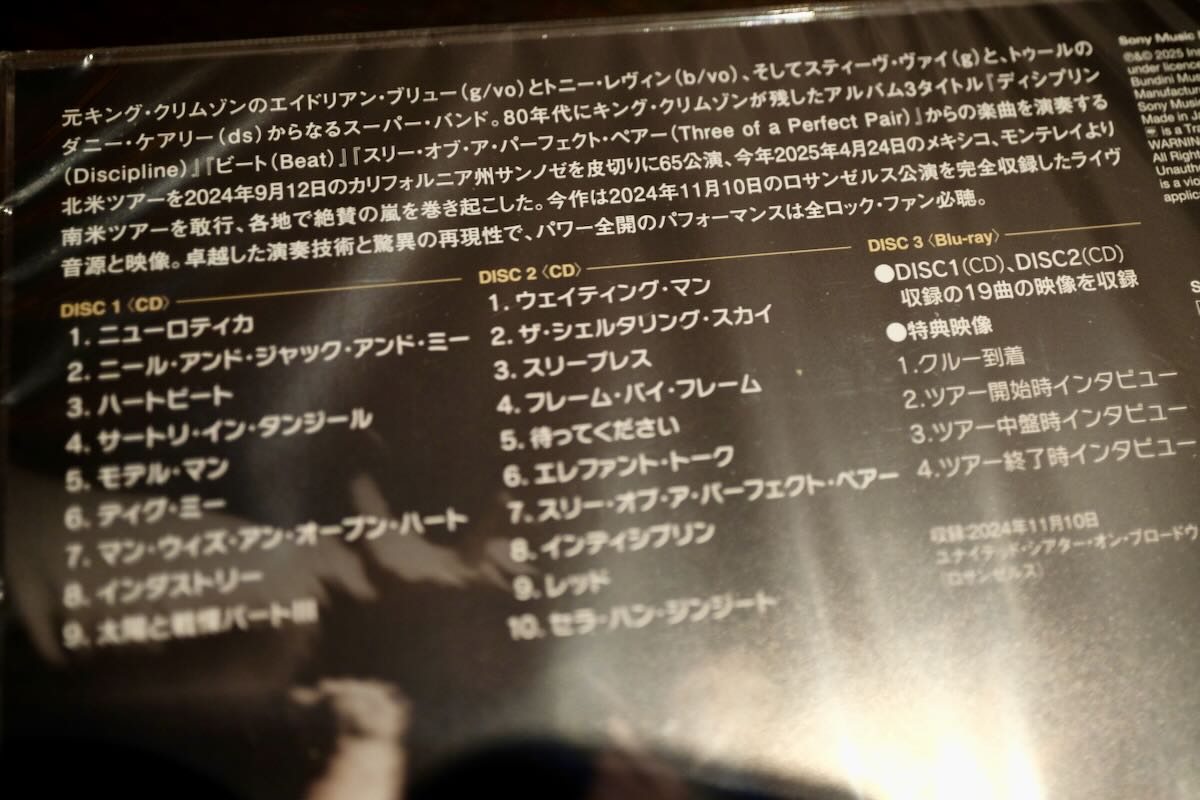 収録されている曲を見てみると、武道館での演奏順と全く同じである。そう言えば、日本武道館では「必ず21時で音を止めなければならない」という規則で時間が足りなかったせいか、「Red」が演奏されなかったのだけれど(当日のセットリストには含まれていたらしい)、個人的には逆に80年代クリムゾンの楽曲に限定されたことで印象が良いのである。僕は、キング・クリムゾンを80年代の3部作から入った人間なので、全く嫌な感じを持っていないどころか、エスニックかつポリリズム全面展開のその時代のクリムゾンが大好きなのである。