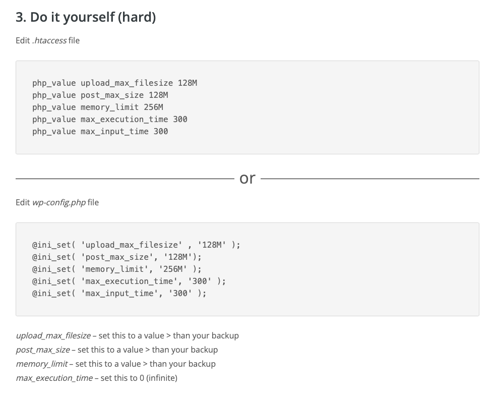 データーベースのバックアップやサイトの引っ越しなどで「All-in-One WP Migration」プラグインを使っている人が必ず遭遇する、インポート時の容量制限。このプラグインの無料版を使っている場合、デフォルトではわずか「8MB」しかなく、全く対応できません。そこで、公式サイトが紹介している手動での制限拡張方法があるのですが(もちろん有料版をお勧めされるのだけれど、手動でのやり方を教えてくれているのは親切)、以前までそれで全く問題なかったのに、今回はサーバーエラーが起きてWordPressが動作不能になりました。