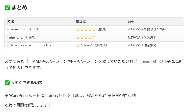 「これで問題は解決します!」と元気が良いが本当かよ、と目を細めて疑う。まずは疑うべしAIの外面の良さ。今回はまだ試したことがない、最も推薦している「.user.ini」を設定してみることにしました。