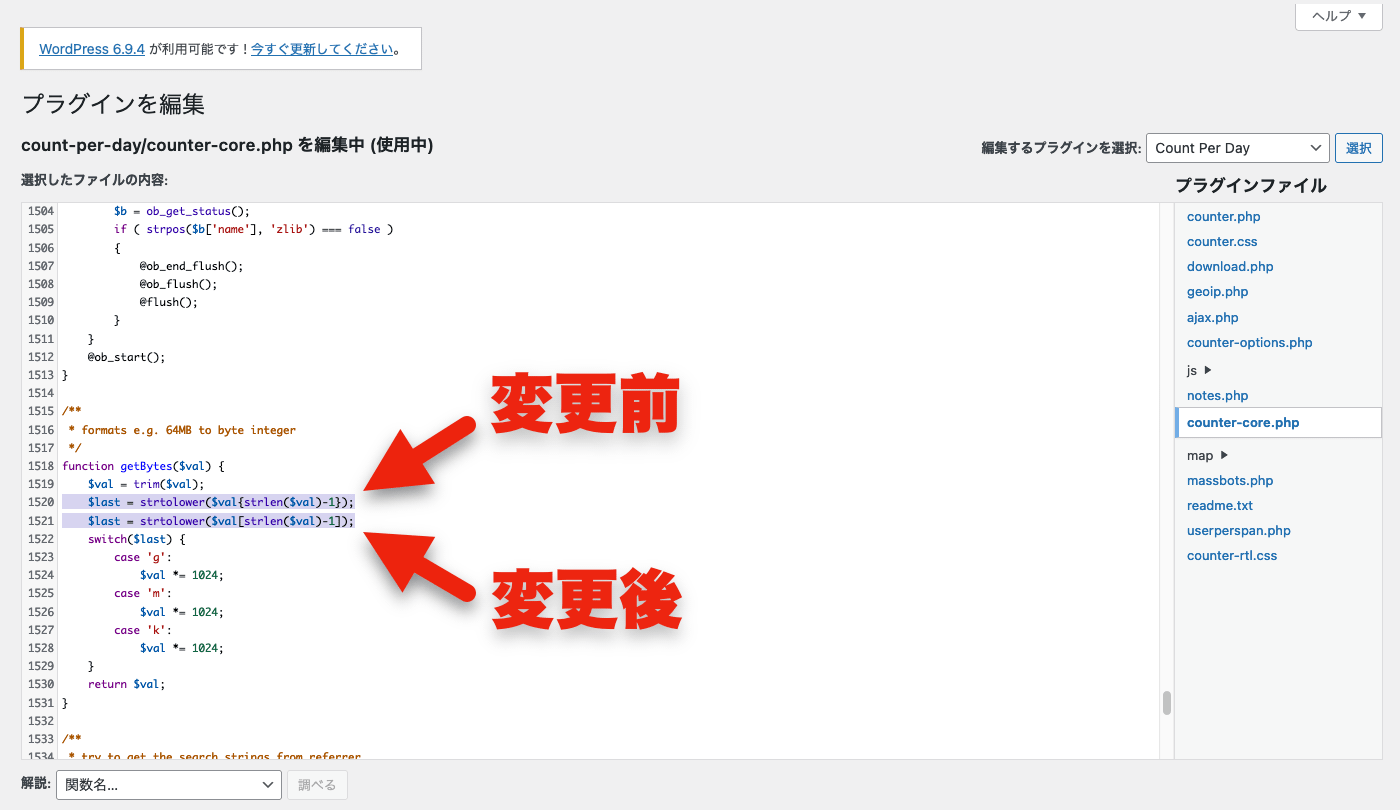 さて、参考記事によると、該当プラグインのフォルダ内にある「counter-core.php」をエディタで開いて、その中の1行だけ修正すれば良いらしい。その修正というのも、